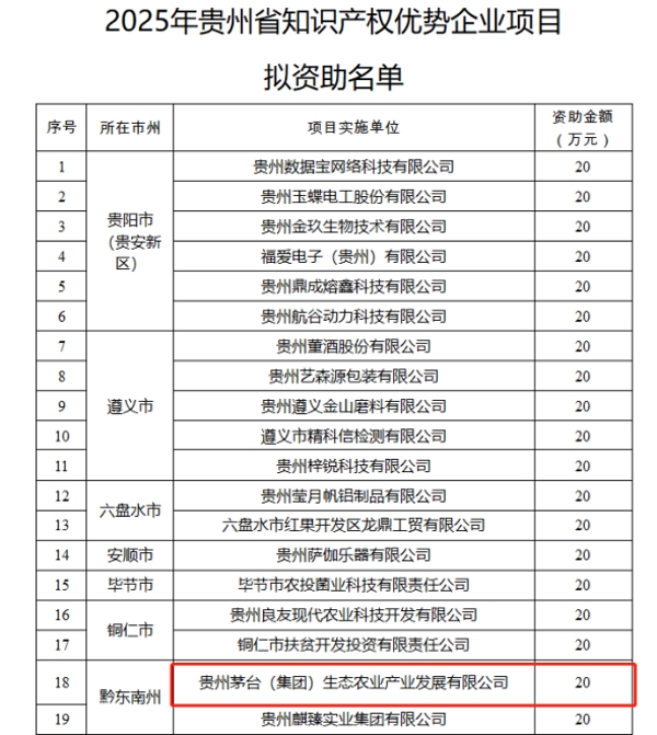 6月24日,贵州省知识产权局正式公布2025年度贵州省知识产权运用促进重点项目拟资助名单,经单位申报、专家评审、信用核查、局党组会审议等相关程序,茅台生态农业公司凭借完善的知识产权管理体系、突出的创新成果转化能力及显著的行业示范效应成功入选“2025年贵州省知识产权优势企业”,并获得20万元项目资助。这是茅台生态农业公司在创新领域中斩获的又一重要殊荣。