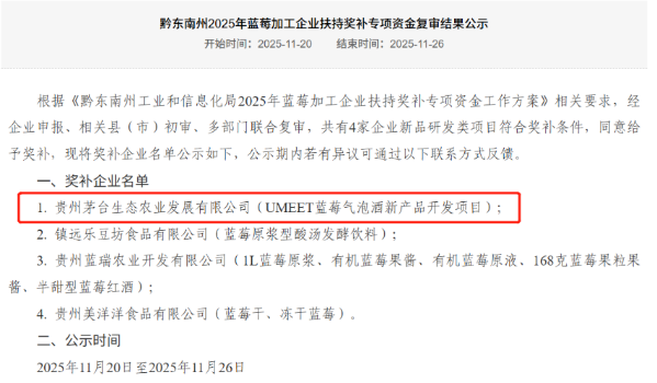 近日,黔东南州工业和信息化局正式公布了“2025年蓝莓加工企业扶持奖补专项资金”复审结果公示名单,贵州茅台(集团)生态农业产业发展有限公司(以下简称“茅台生态农业公司”)凭借其在蓝莓新产品开发方面的卓越表现,于2025年12月16日成功荣获50万元专项资金奖补。此项殊荣是地方政府对公司在蓝莓新品开发与科研创新领域突出成果的权威认可,为企业深化产业创新注入强劲动力。