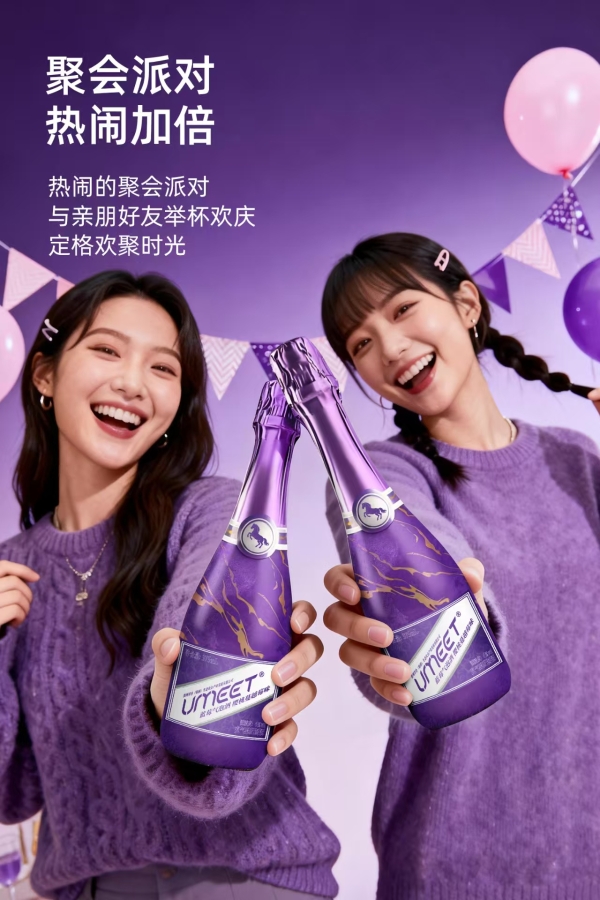 产品力是此次市场表现的重要支撑。UMEET蓝莓气泡酒(樱桃蔓越莓味)选用贵州丹寨山地蓝莓,采用-18℃低温锁鲜、纯水浸提、双重酶解等工艺,搭配齐紫鎏金的新春限定包装、375mL的适饮容量与6%vol的低度酒精度,精准契合了年节赠礼、聚会分享等多重场景需求。